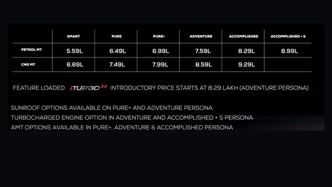 The feature-loaded iTurbo comes with an introductory price starting at ₹8.29 lakh for the Adventure persona. Sunroof options are available on the Pure+ and Adventure personas. The turbocharged engine option is offered in the Adventure and Accomplished+ S personas. Additionally, AMT options are available across the Pure+, Adventure, and Accomplished personas.